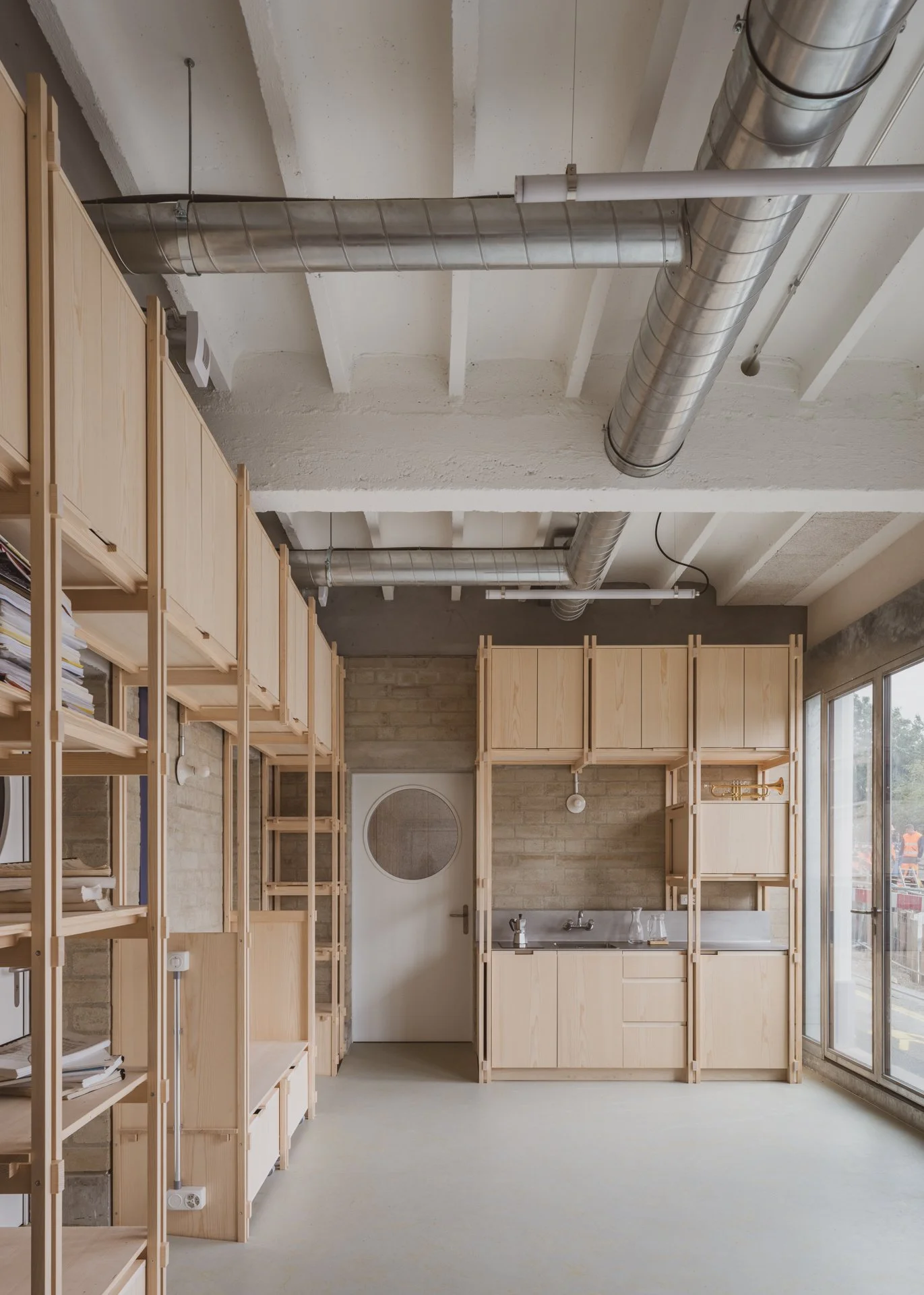 Mandaté pour l’aménagement intérieur global, Wood-Concept Jules Desarzens joue une partition tout bois voulu par l’architecte. Conçu comme un écrin, une boite dans la boite, le studiolo est habillé toutes surfaces, sur un squelette en épicéa, de contreplaqué bois en pin déroulé. Ce matériau brut, dit d’emballage, recherché pour ses propriétés mécaniques, esthétiques et de durabilité obtenues par déroulage de grumes sans déchets, se sublime par la dextérité de sa mise en oeuvre et ainsi confère au lieu une atmosphère à la fois domestique et intime.