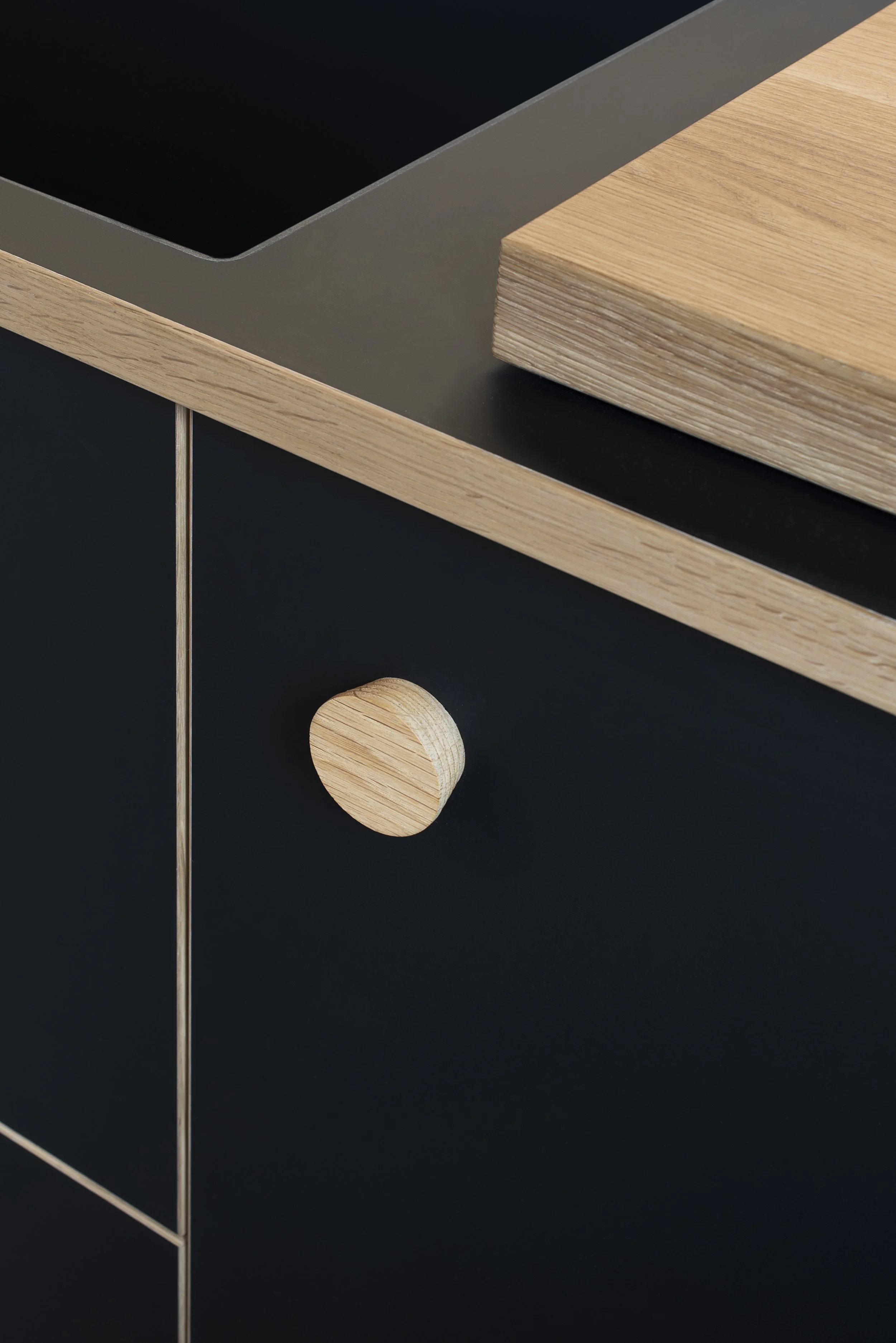 Le bois préalablement blanchi à la chaux a été traité au savon noir en finition naturelle assurant au matériau la pérennité d’une bonne tenue. Ce processus de finition complètement écologique est utilisé au XVe siècle en Suisse dans le Pays-d’Enhaut pour conserver les boiseries intérieures en épicéa des chalets de la région. Il a été remis au goût du jour par l’ébéniste.